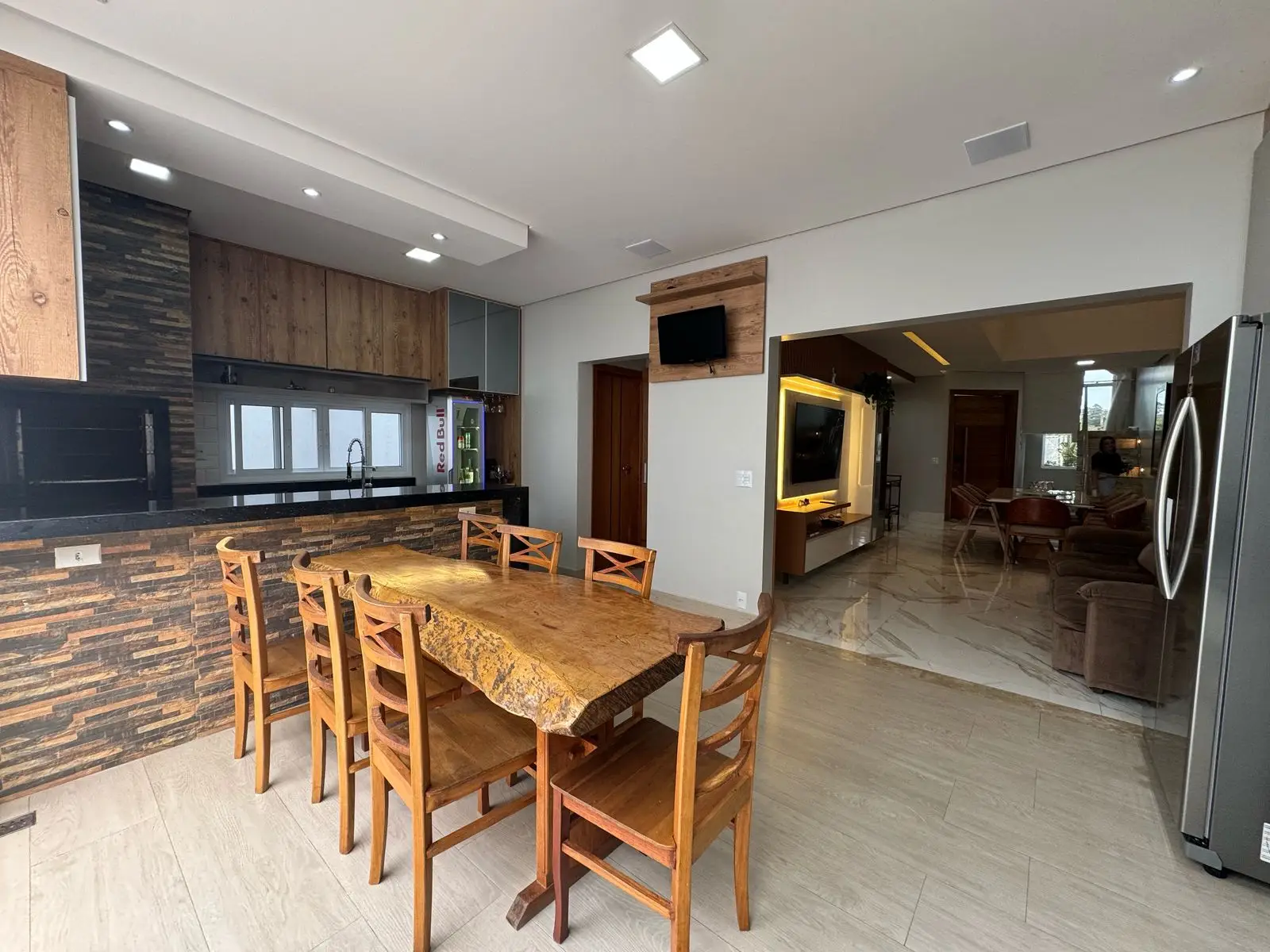 Com 234 m² de área construída em um terreno de 330 m², o imóvel conta com quatro dormitórios, sendo uma suíte, quatro banheiros bem distribuídos, sala ampla em dois ambientes com lareira e uma cozinha espaçosa e funcional. A área de serviço é prática, e há cinco vagas de garagem, garantindo comodidade e conforto.